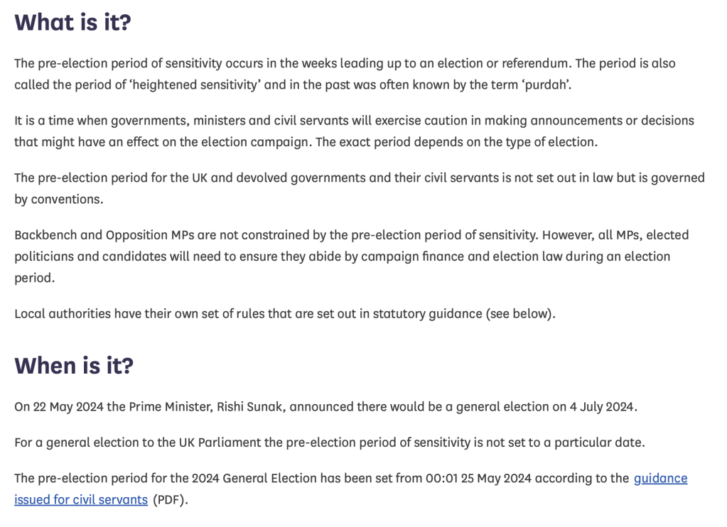 The official government / civil service pre-election period of sensitivity – what used to be known as ‘purdah’ – having begun at 00:01 on Saturday. See the below screen grab for further information: